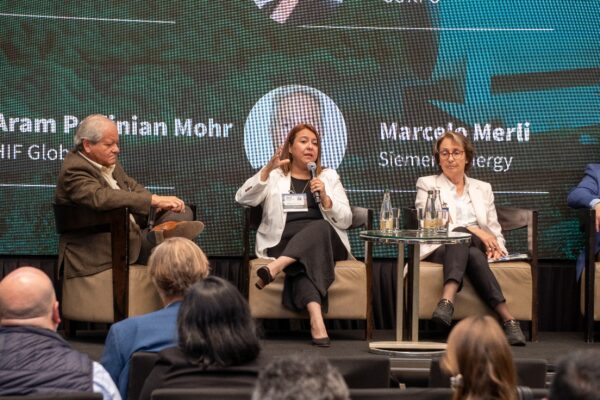 De izquierda a derecha: Hernán Moreno, Moderador AHK Chile; Alejandra Hidalgo, Encargada Nacional de Capital Humano del Ministerio de Energía; Ana María Ruz, Directora del Comité de H2V de Corfo.